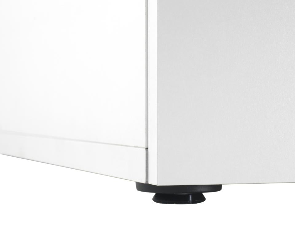 - Egenskaper: Möbeln är tillverkad i solid vit melaminplatta där bärande delar är 19 mm tjocka och luckor samt hyllor 16 mm. Samtliga kanter, även de som inte syns, är försedda med pålimmade kantband vilket ger extra skydd mot vatten och fukt. På baksidan finns två stora genomföringshål för slangar och kablar samt ett hål i mellanväggen som gör det enkelt att dra teknik mellan skåpets olika sektioner. Levereras med två eller tre flyttbara hyllor som kan placeras efter behov.