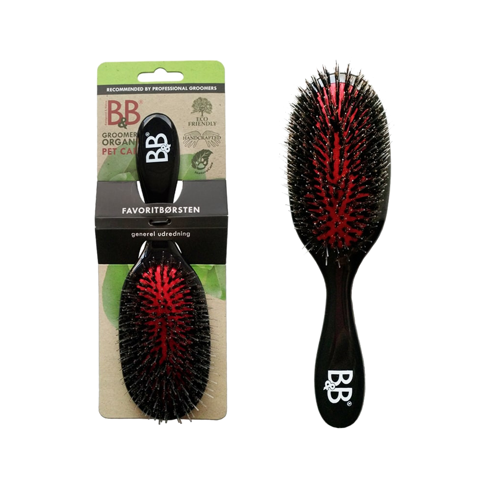 En mångsidig borste som passar kort, medellång och lång päls. De mjuka borststråna i en kombination av svinborst och nylon tränger varsamt ner i pälsen utan att skada hud eller hår, samtidigt som de avlägsnar lösa hår och smuts. Borsten hjälper till att fördela de naturliga oljorna i pälsen vilket ger en frisk, mjuk och glänsande finish.