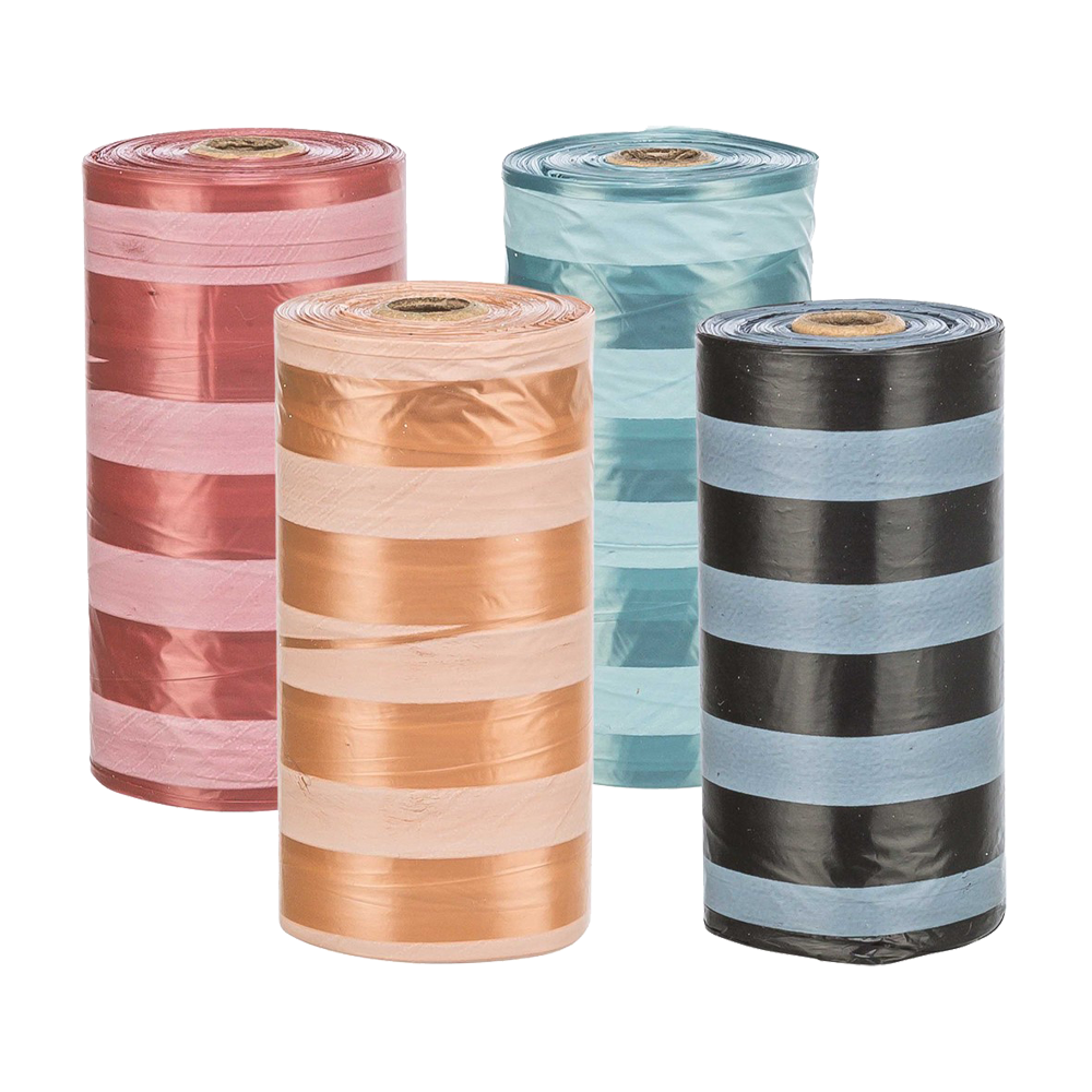 En uppsättning randiga bajspåsar som passar alla standardbajspåshållare. Varje rulle innehåller 20 påsar och är tillverkade i plast som är slitstark och enkel att knyta.