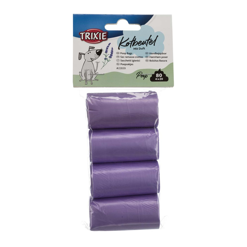 Doftande bajspåsar med mild lavendelarom som effektivt döljer oönskad lukt vid hantering. Varje rulle innehåller 20 påsar och levereras i set om fyra rullar, tillverkade i slitstark plast som är enkla att riva av och knyta.