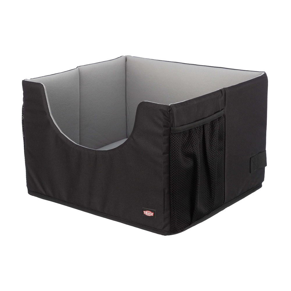 Ett smidigt bilsäte som ger små hundar en säker och bekväm plats under bilresan. Sätet är enkelt att fästa med remmar och har en öppning för säkerhetsbälte som gör att hunden kan spännas fast på ett säkert sätt. Den vändbara dynan med skumgummifyllning och avtagbart överdrag är enkel att handtvätta. Bilsätet är hopfällbart för platssparande förvaring och utrustat med nätfickor för praktisk förvaring.