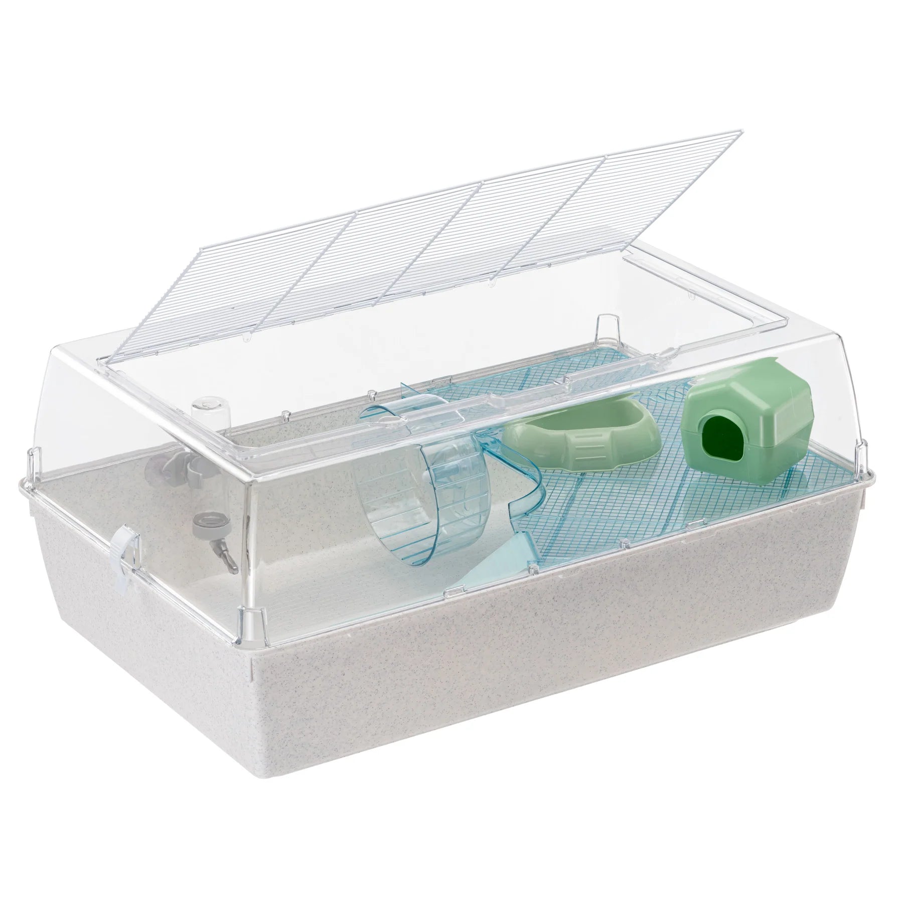 - Funktion: Konstruktionen består av en kraftig plastbotten och ett transparent plastlock med målat metallgaller som säkerställer god ventilation och full insyn. Gallret kan lyftas upp och låsas med vridbara hakar för säker och smidig åtkomst. Buren är modulär och kan kopplas ihop med andra moduler eller tillbehör för gnagare, vilket gör det möjligt att utöka livsytan över tid.