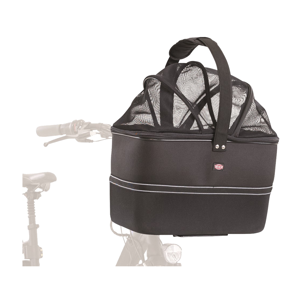 En funktionell cykelkorg för montering på styret, perfekt för att ta med ditt husdjur på cykelturen. Tack vare snabbfästet är korgen enkel att ta av och kan användas som transportväska med handtag. Utrustad med nät, regnskydd och inbyggt kort koppel som ökar säkerheten. Reflekterande detaljer ger extra synlighet och det löstagbara vadderade botteninlägget med plyschöverdrag gör resan bekväm. Tillverkad i formbevarande EVA-material.