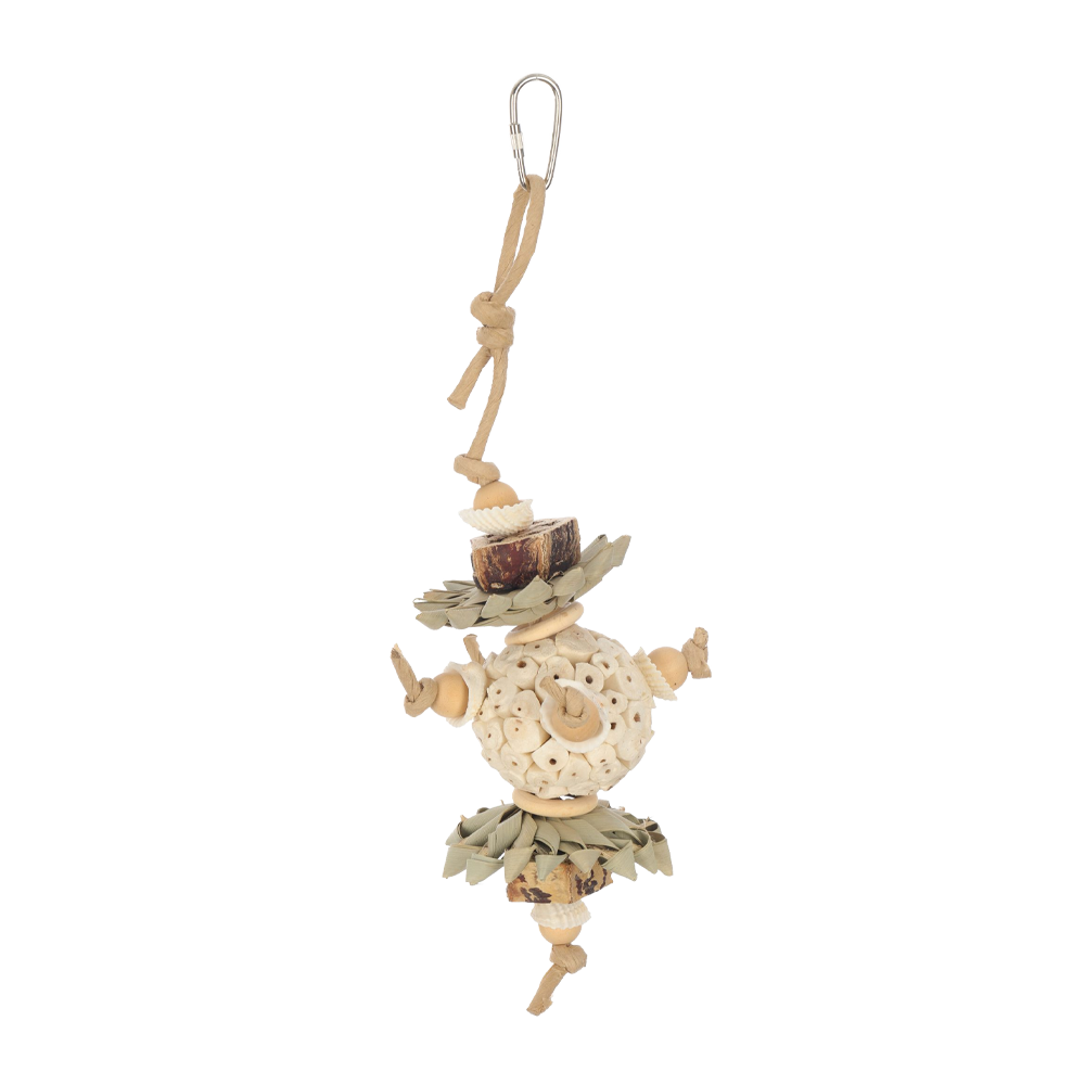 En aktiverande leksak tillverkad av naturliga material som trä och rep, skapad för att uppmuntra fågelns naturliga beteenden. Den robusta konstruktionen gör den tålig för daglig lek och ger både mental och fysisk stimulans i burmiljön.