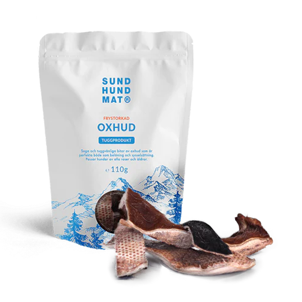 Frystorkad Oxhud 110 g är sega och tuggvänliga remsor av 100 % oxhud som ger både belöning och långvarig sysselsättning samtidigt som de stimulerar hundens naturliga tuggbehov. Den skonsamma frystorkningsprocessen utan värme bevarar råvarans näringsämnen och smak utan att några tillsatser behöver användas.