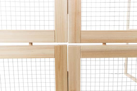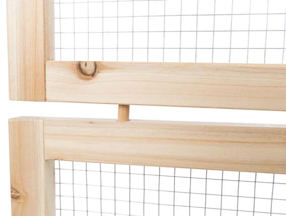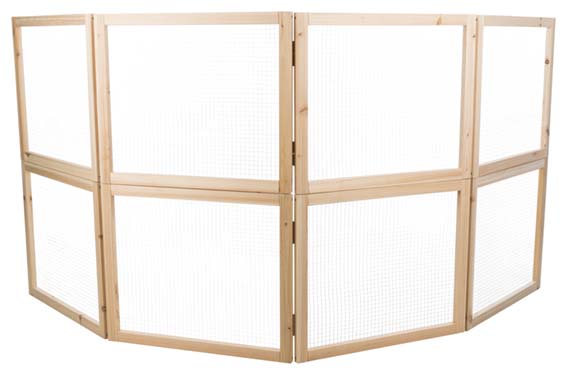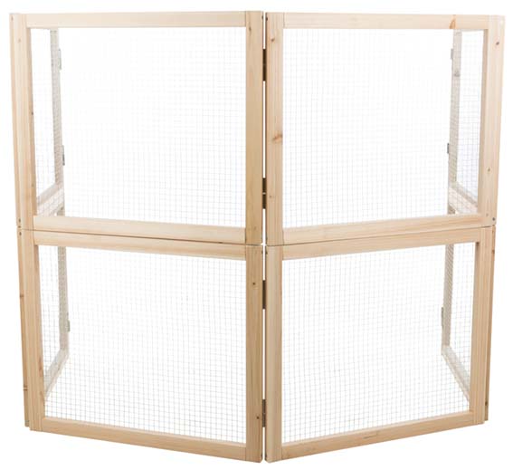 - Mått: Inhägnaden består av 4 delar som vardera mäter 60 cm i bredd och 50 cm i höjd, vilket ger en total längd på 60–240 cm beroende på hur den monteras. Höjden på 50 cm passar väl för marsvin och kaniner, även för kaniner som tycker om att hoppa.