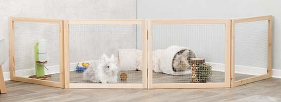 En praktisk och utbyggbar inhägnad som ger marsvin och kaniner en trygg, flexibel och naturlig yta för lek och rörelse inomhus.