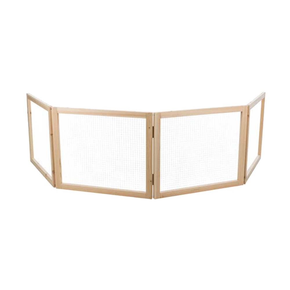 - Övrigt: Tillverkad av obehandlat trä i kombination med metall, vilket ger en stabil men naturlig känsla. Materialen gör inhägnaden enkel att integrera i hemmiljöer utan att kännas dominerande.