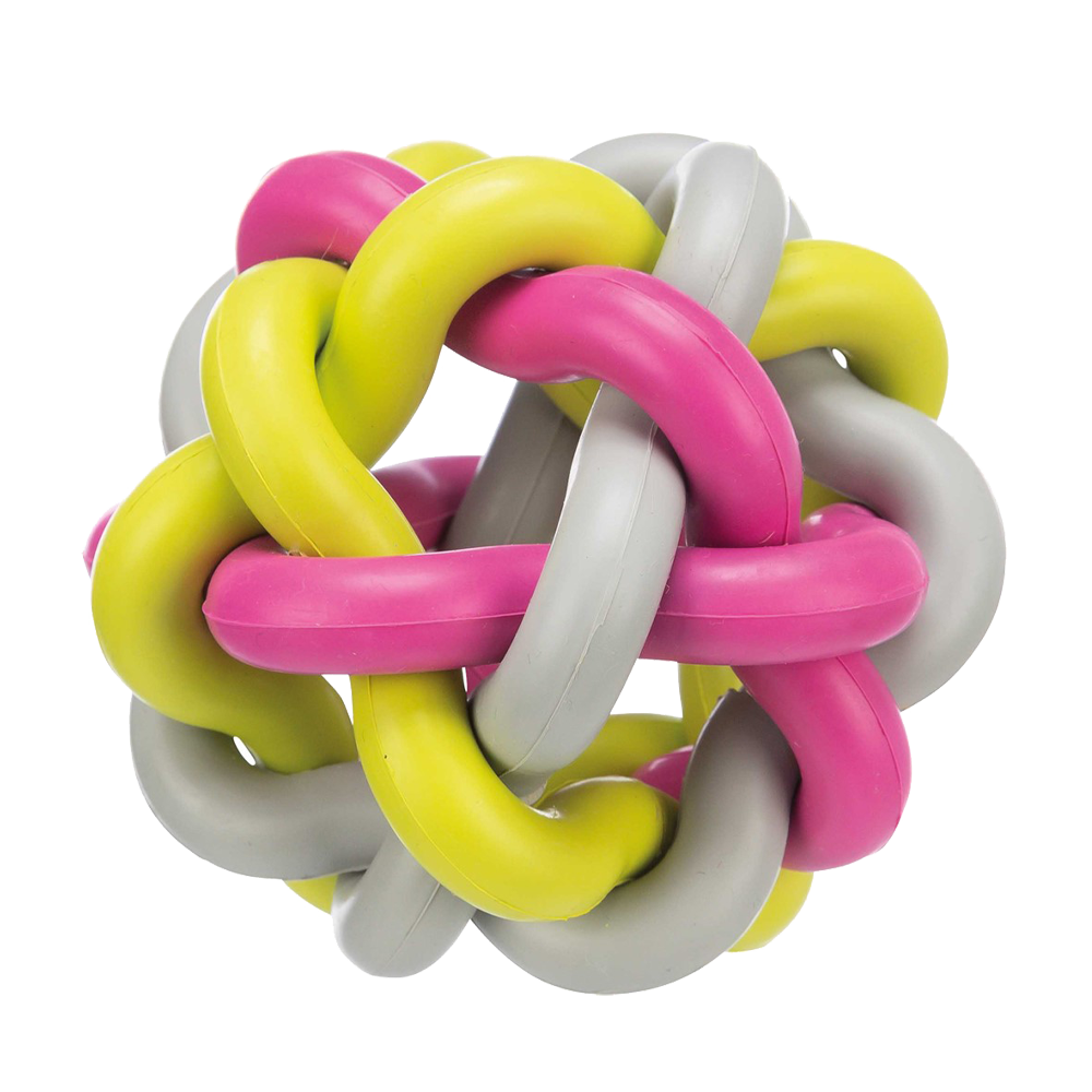 En slitstark boll i gummi med knutmönster som masserar tandköttet och främjar munhälsan vid tugg. Den studsar oregelbundet och passar perfekt för både kastlek och ensamlek. Materialet är flexibelt men hållbart, vilket gör den lämplig även för hundar med starka käkar.