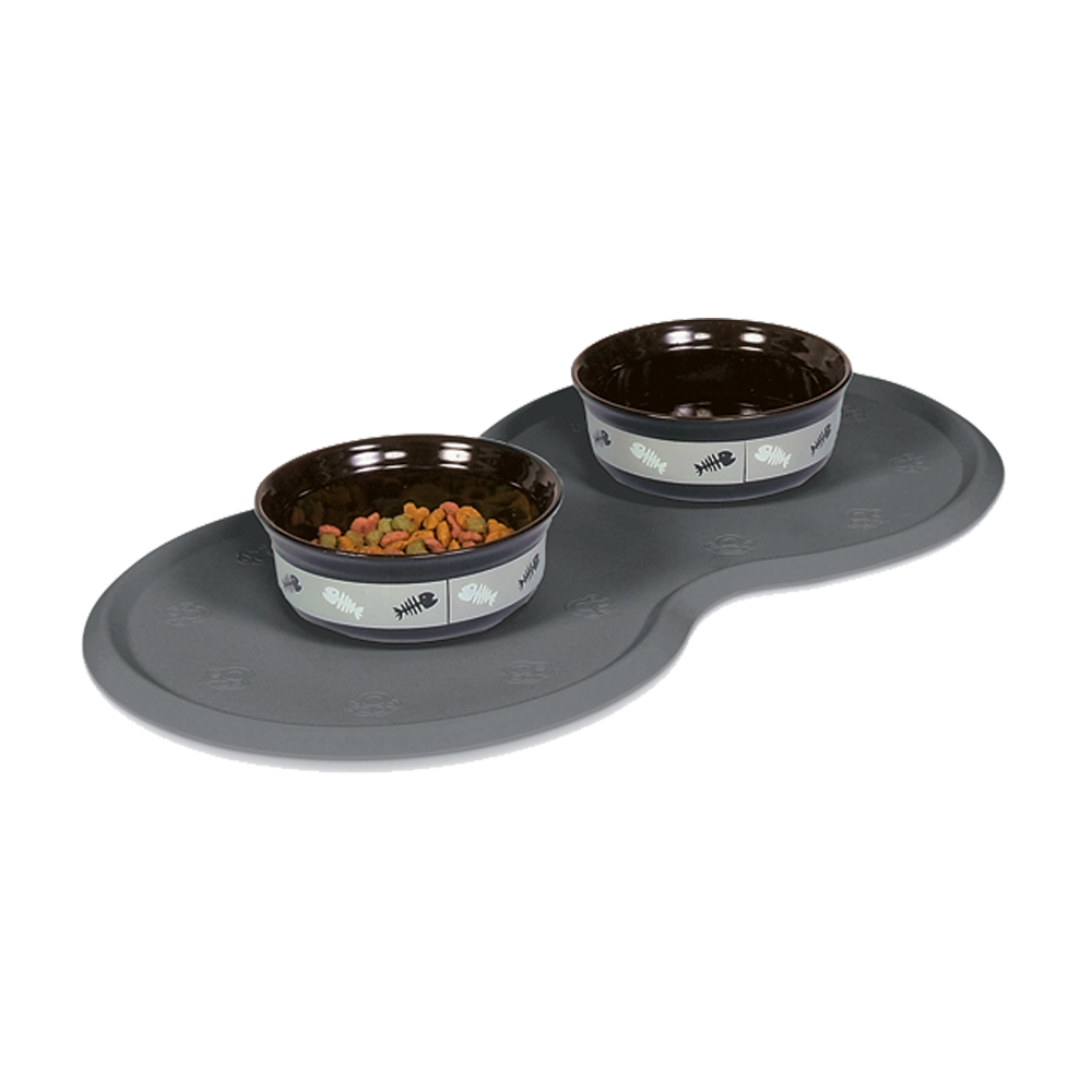 Halkfritt underlägg i naturgummi med upphöjd kant som håller mat- och vattenskålar på plats och förhindrar spill. Passar skålar upp till ø 21 cm.