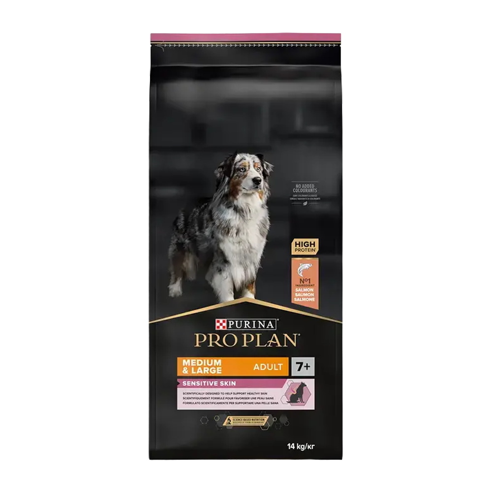 PURINA PRO PLAN Medium & Large Adult 7+ Sensitive Skin är ett komplett torrfoder utvecklat för äldre hundar av medelstora och stora raser med känslig hud. Receptet är rikt på högkvalitativ lax och innehåller en särskild kombination av hudvårdande näringsämnen som aminosyror, essentiella fettsyror samt vitaminer och mineraler som bidrar till en frisk hud och en blank päls. Anpassade protein- och fettnivåer stödjer ett hälsosamt åldrande samtidigt som näringsämnen för leder hjälper hunden att behålla en aktiv livsstil.