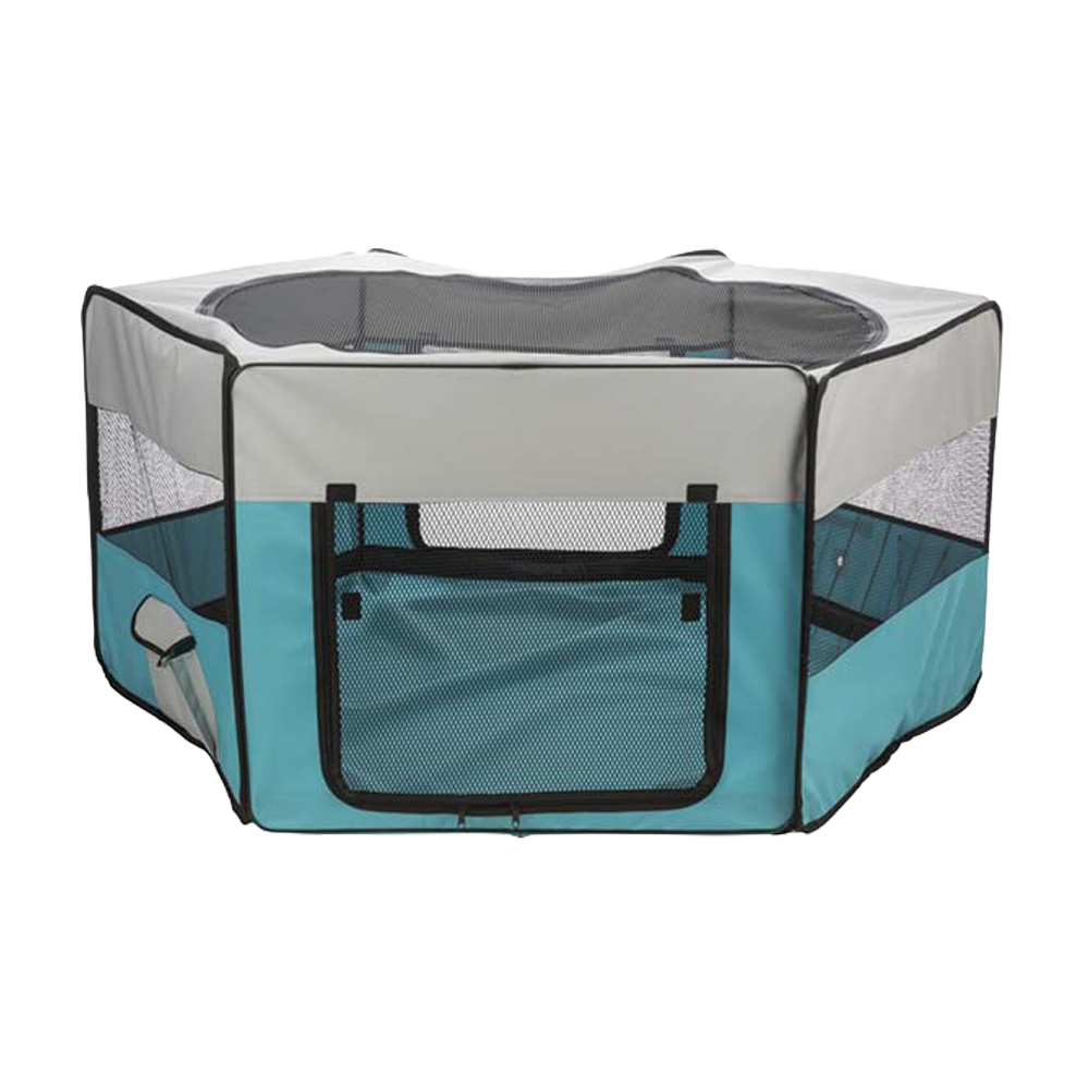 - Funktion: Tillverkad i slitstark polyester för inom- och utomhusbruk. Den avtagbara bottnen tillsammans med gummibeläggning och upphöjd sidokant skyddar effektivt mot smuts, fuktiga och kalla underlag. Det avtagbara nätet i toppen förhindrar att djuret hoppar ur, medan marköglor gör det möjligt att fästa hagen säkert i underlaget utomhus. Två sidofickor ger praktisk plats för förvaring av tillbehör.